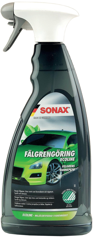 Produkten är syrafri och är skonsam mot all bilens exteriör. Spraya på fälgarna och vänta minst 3-5 min